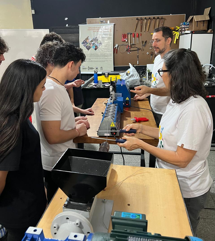Durante a oficina, os estudantes tiveram contato com processos de reaproveitamento e reciclagem, entendendo como a ciência e o design podem trabalhar juntos para propor soluções inovadoras de sustentabilidade.